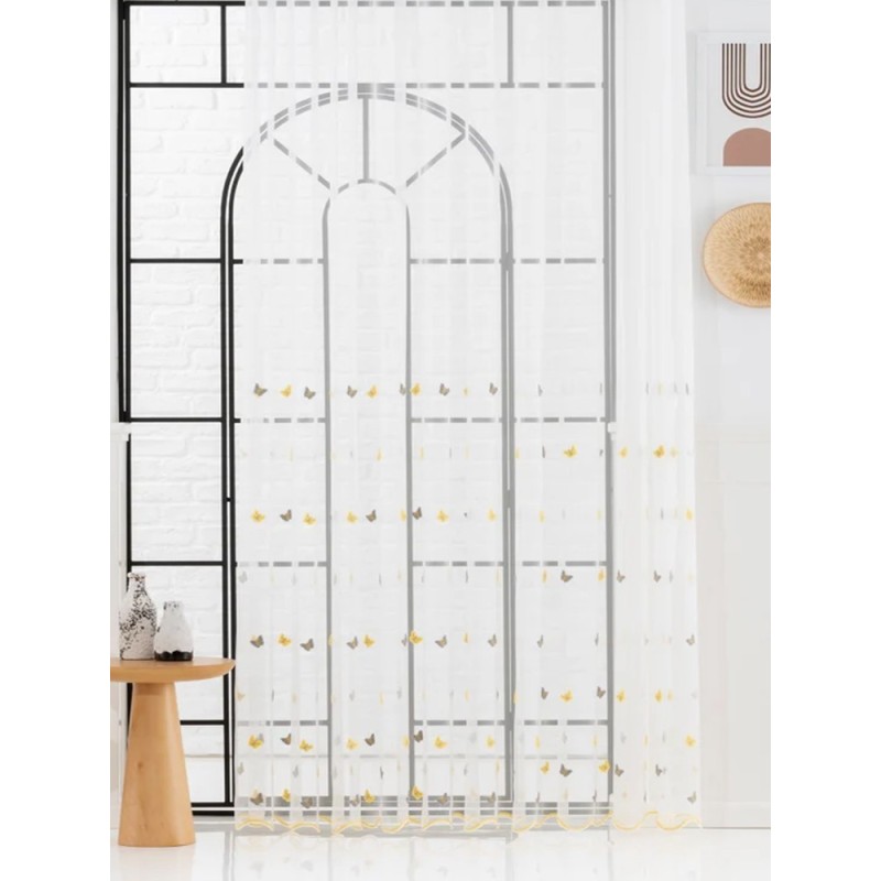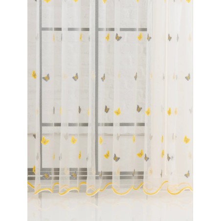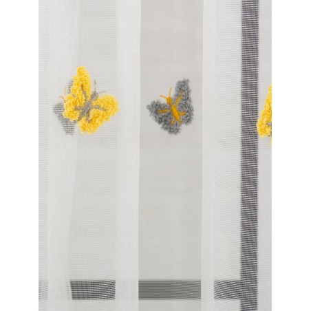 Прозрачна материя за перде, с фини релефни и бродирани пеперудки в жълто и сиво. Текстил, който добавя елегантност и стил в интериора, особено на детска стая. Придава нежен и съвременен вид, като пропуска светлината и подчертава лекотата на пространството. Максимална височина на текстила 280см.