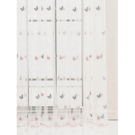 Прозрачна материя за перде с фини релефни бродирани пеперудки в розово и сиво. Текстил, който добавя елегантност и стил в интериора, особено на детска стая. Придава нежен и съвременен вид, като пропуска светлината и подчертава лекотата на пространството. Максимална височина на текстила 280см.